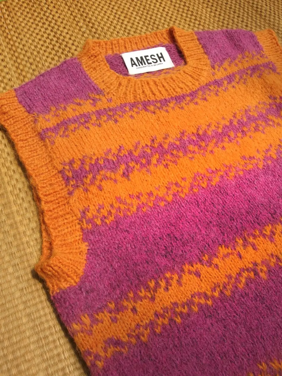 Inspired by the island’s natural minerals, alternating Amethyst and Citrine stripes form a beautiful textured pattern, lending a playful yet considered charm to this one-of-a-kind piece. Thoughtfully designed for versatility, the top features a classic crew neckline, with ribbed armholes and a structured waistband that balance its relaxed silhouette. Ideal for layering across seasons.