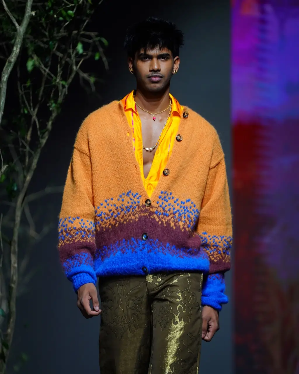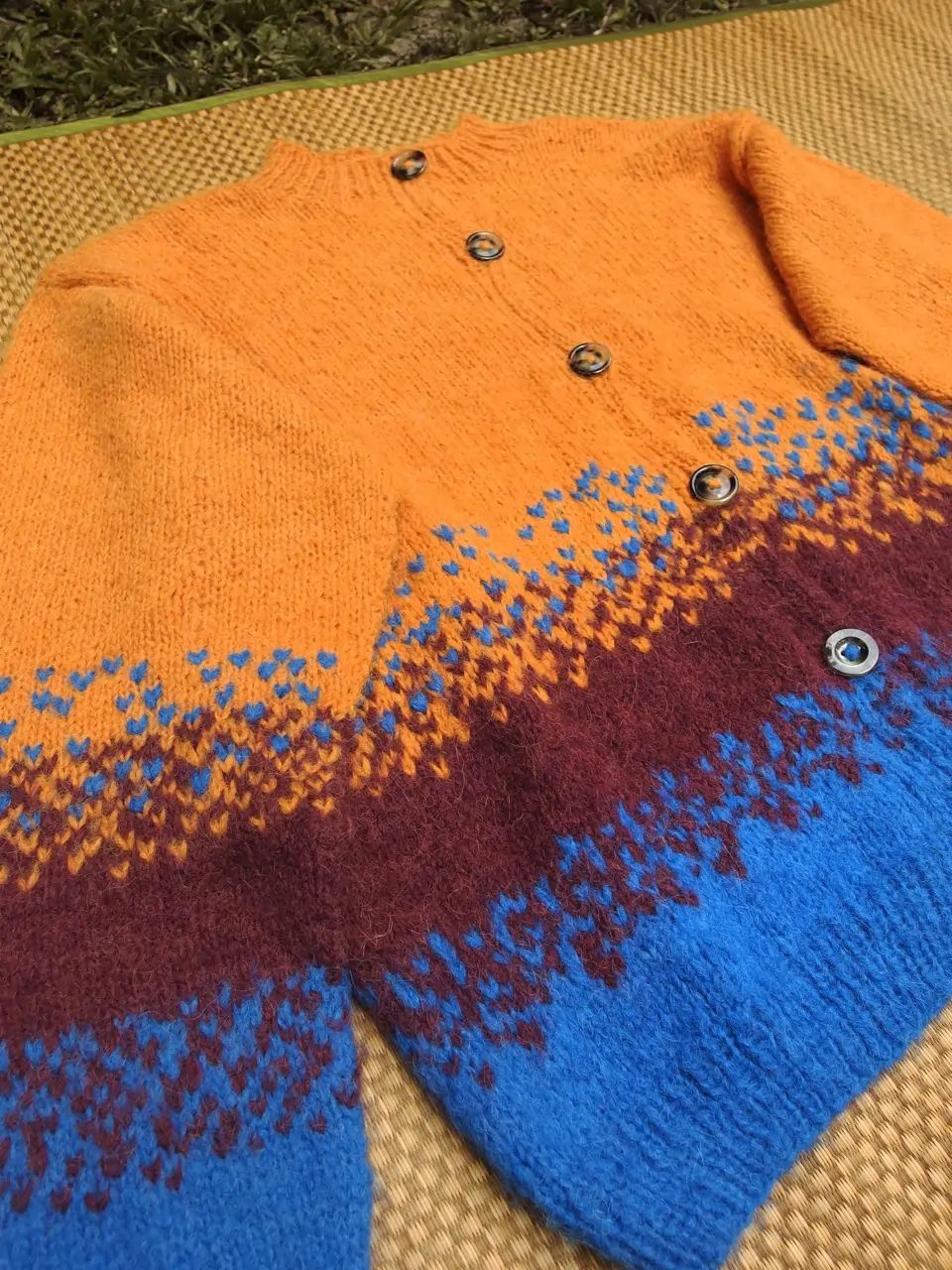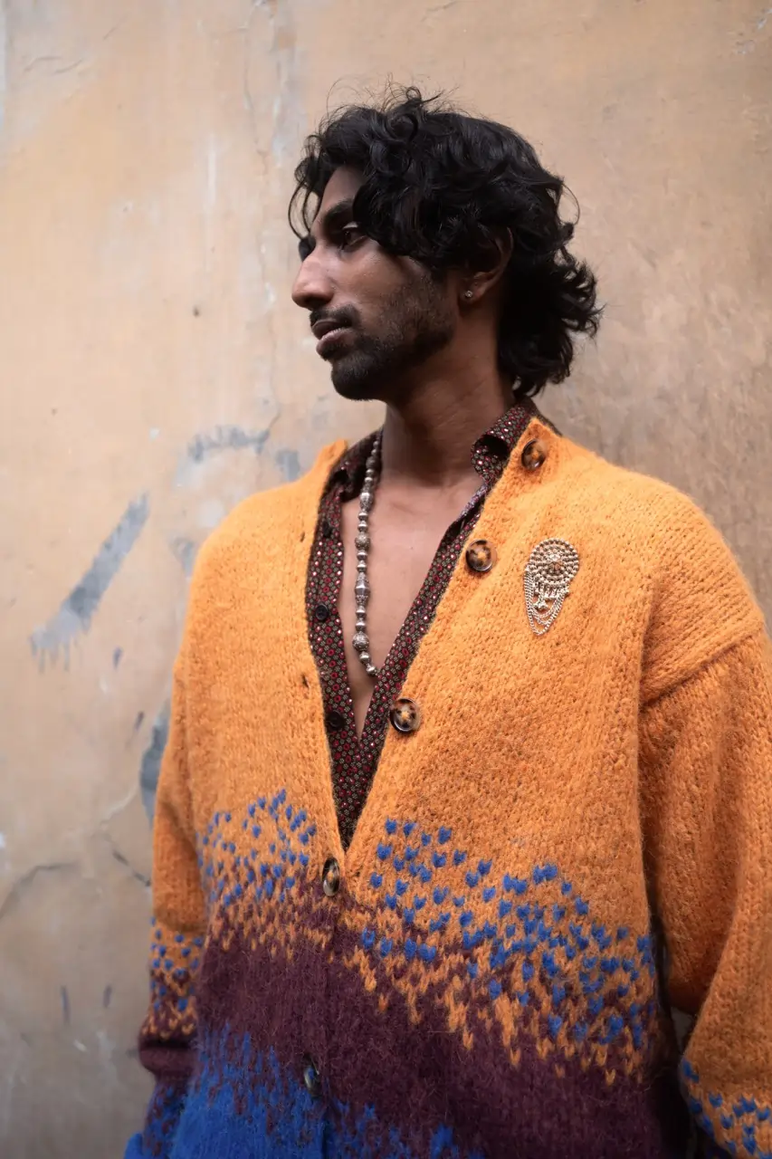 This AMESH Artisanal hand-knitted cardigan is crafted by skilled Sri Lankan home knitter Lalitha, using deadstock Norwegian Børstet Alpakka wool. The unique yarn blends soft alpaca fibres with a durable nylon thread, creating a brushed, airy texture that is both lightweight and luxuriously soft. Naturally hollow and breathable, the fibre adapts effortlessly to changing temperatures, providing warmth in the cold while remaining cool and comfortable in warmer climates. Inspired by the island’s rich natural minerals, a striking fusion of rich turmeric, cobalt blue, and deep burgundy tones brings depth and character to this one-of-a-kind piece. Thoughtfully designed for versatility, the cardigan features a classic front button closure, complemented by ribbed cuffs and a structured waistband for a refined, timeless silhouette.